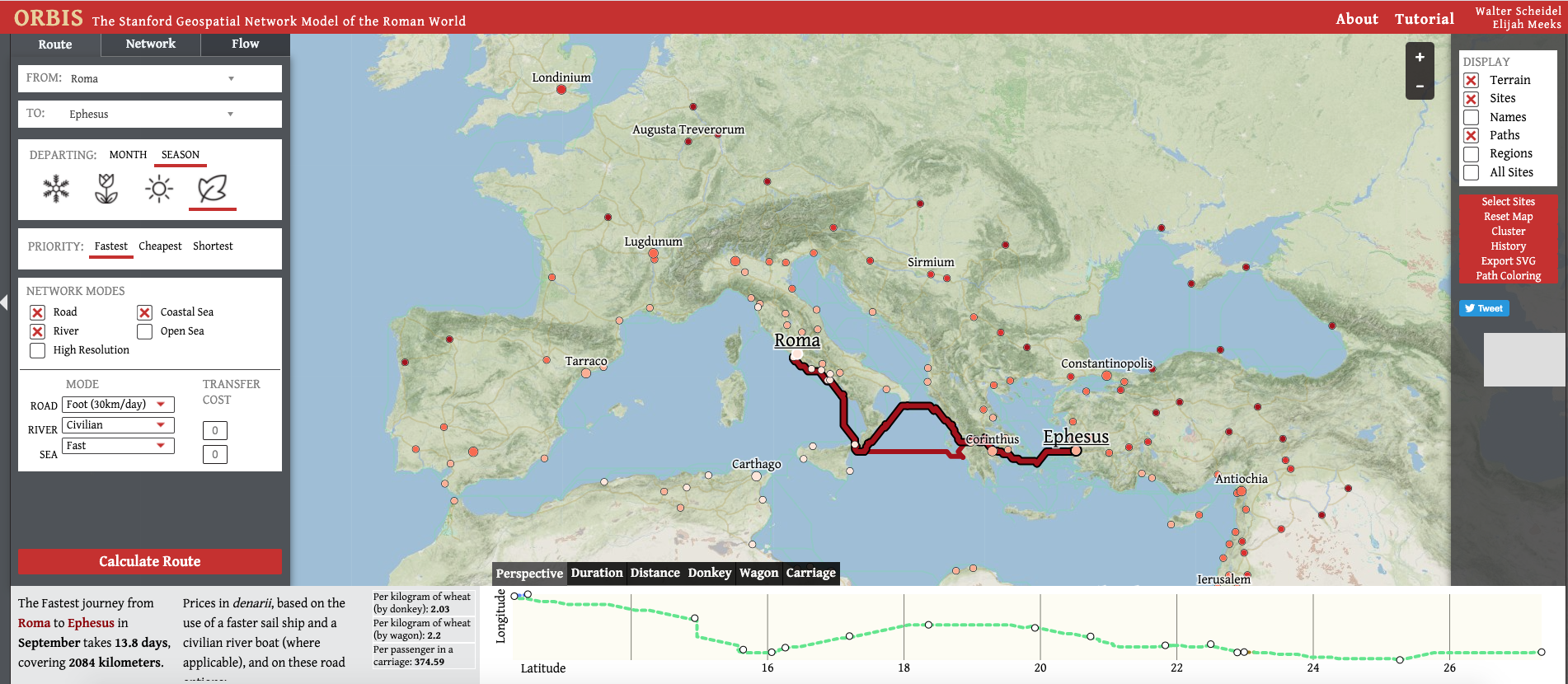 Am găsit recent un site foarte util care măsoară timpul de călătorie în imperiul roman în funcție de sezon și mijlocul de călătorie. Este foarte bine conceput. În ce privește exactitatea probabil că există o marjă de aproximare. Vă las pe voi să-i decideți exactitatea. Pentru mine e o unealtă binevenită.